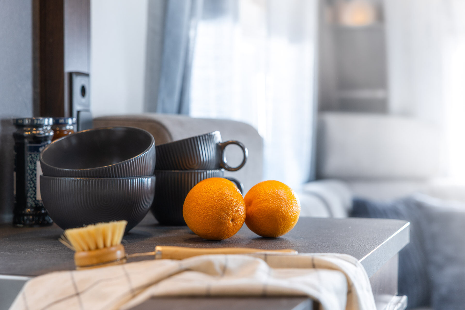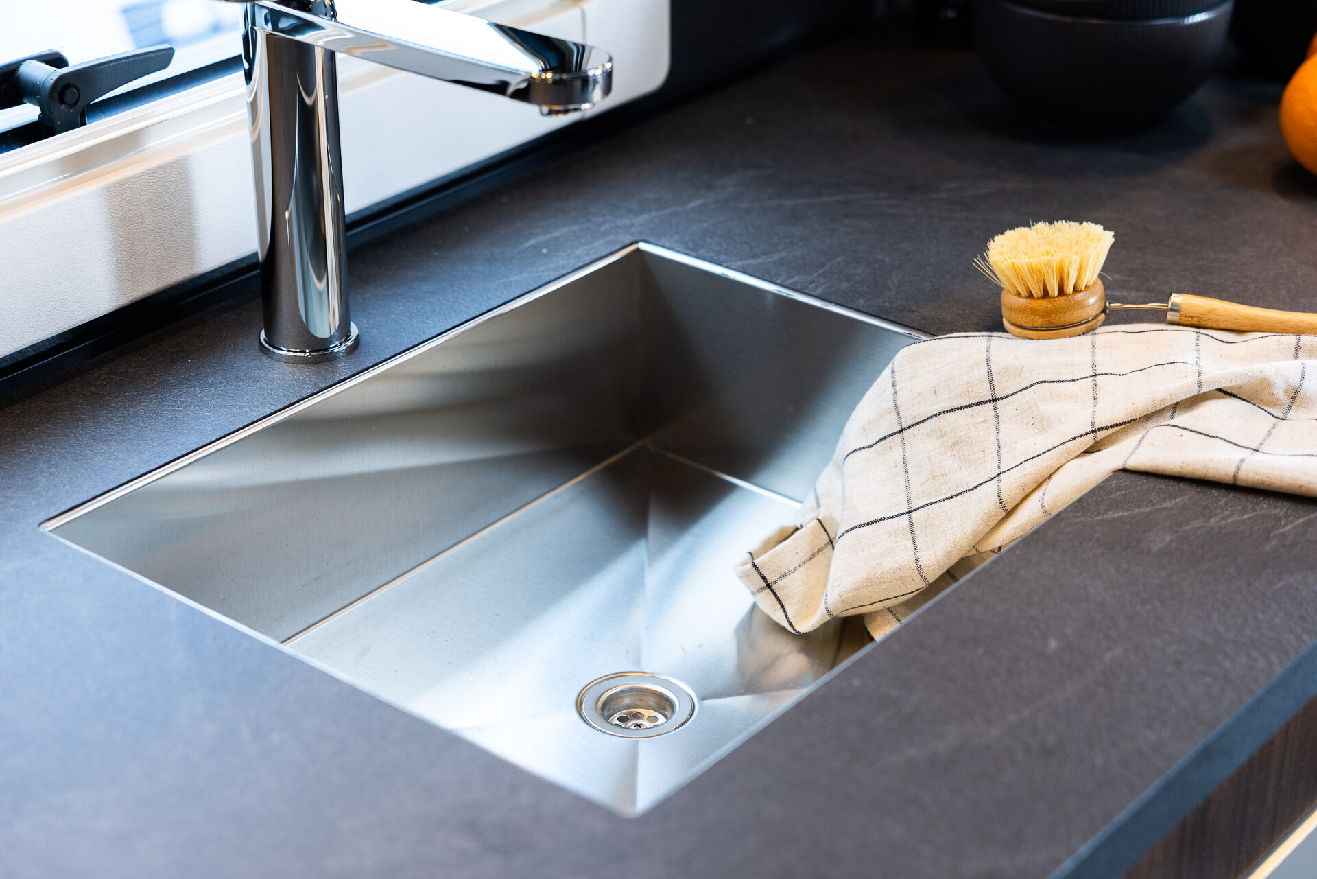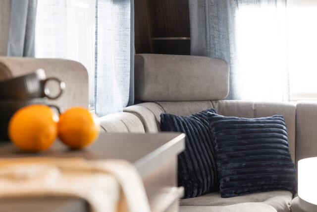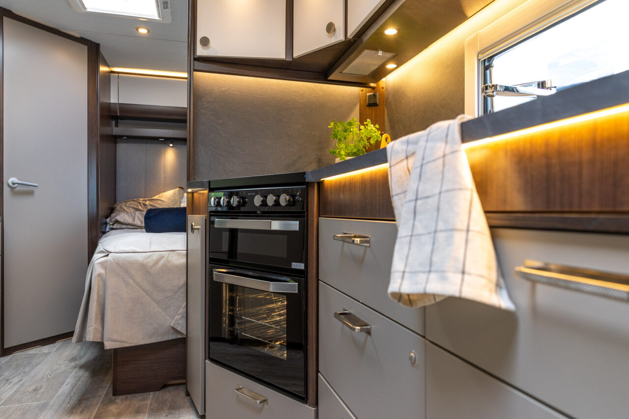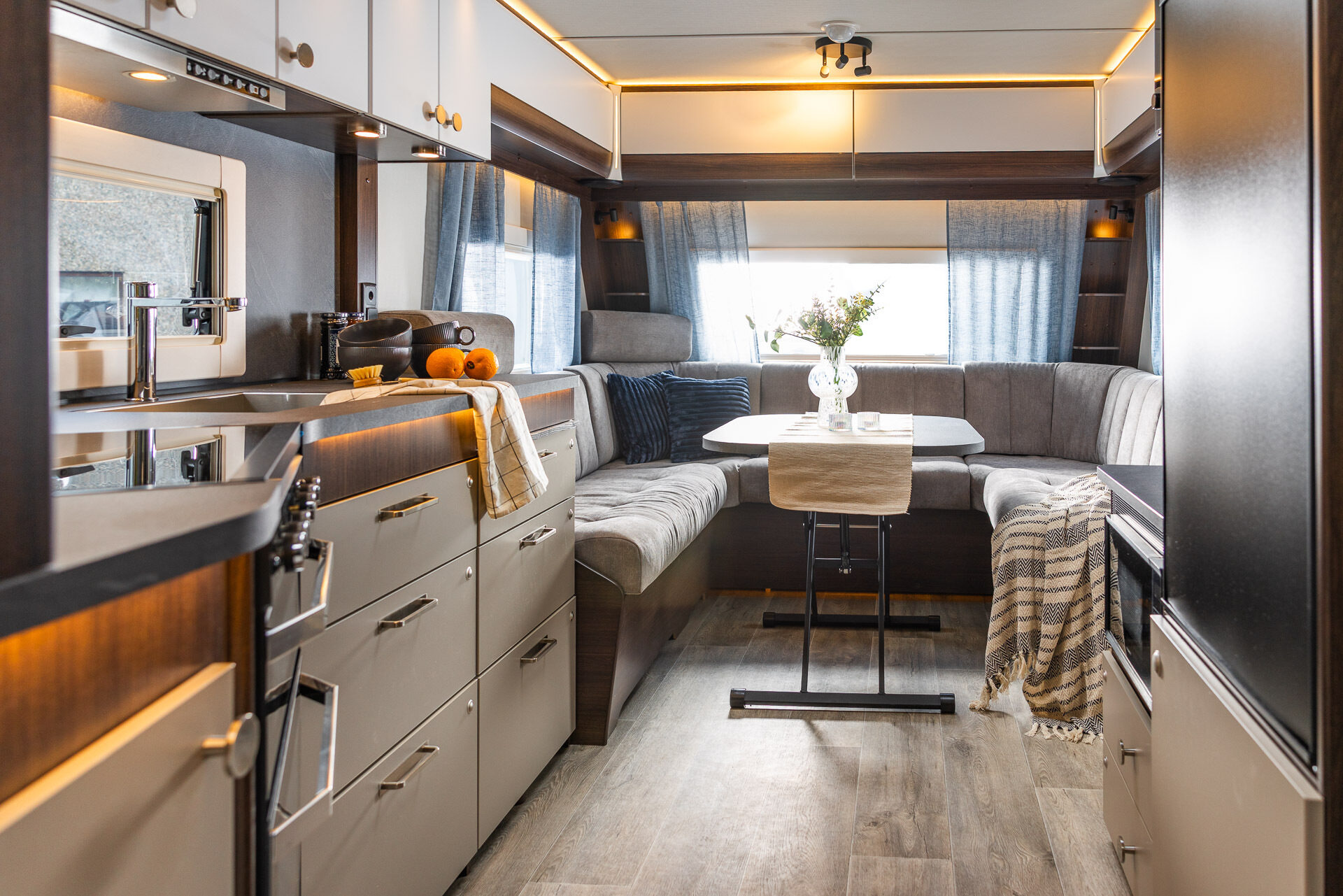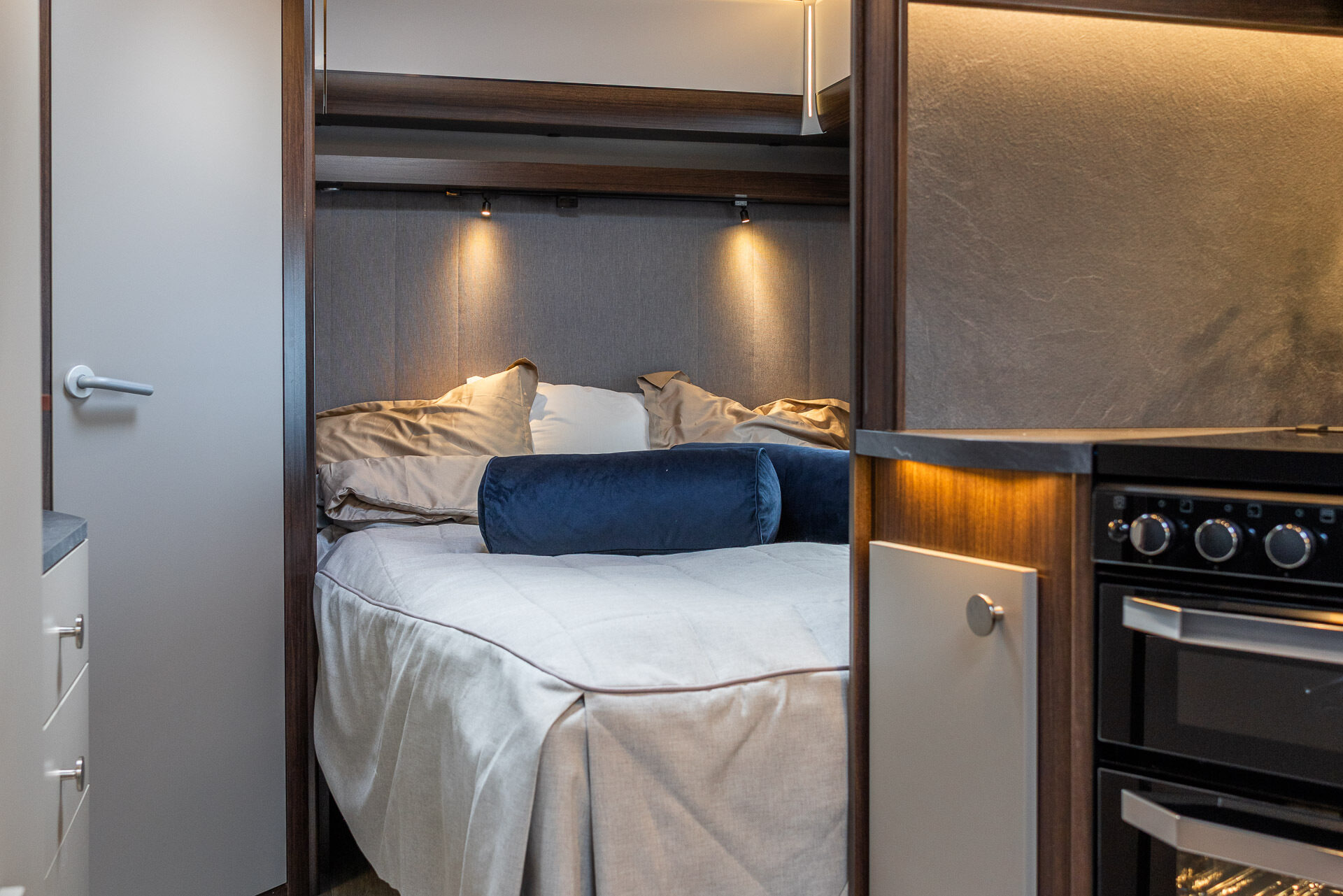 A compact caravan ideal for trips with many stops. It features a French bed, a small corner bathroom, and a pleasant L-shaped kitchen with workspace. If you need more sleeping space, the sofa can be converted, or you can add overhead storage with a bunk option.
