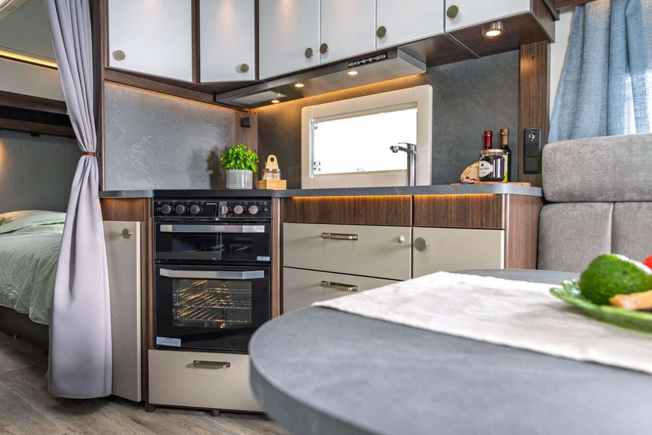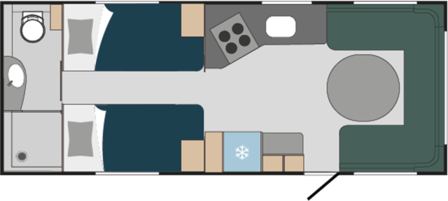 A caravan that’s easy to tow despite its size. The layout features two fixed single beds, an L-shaped kitchen, and a spacious bathroom with a shower. The lounge sofa offers extra sleeping space for children or visiting guests.