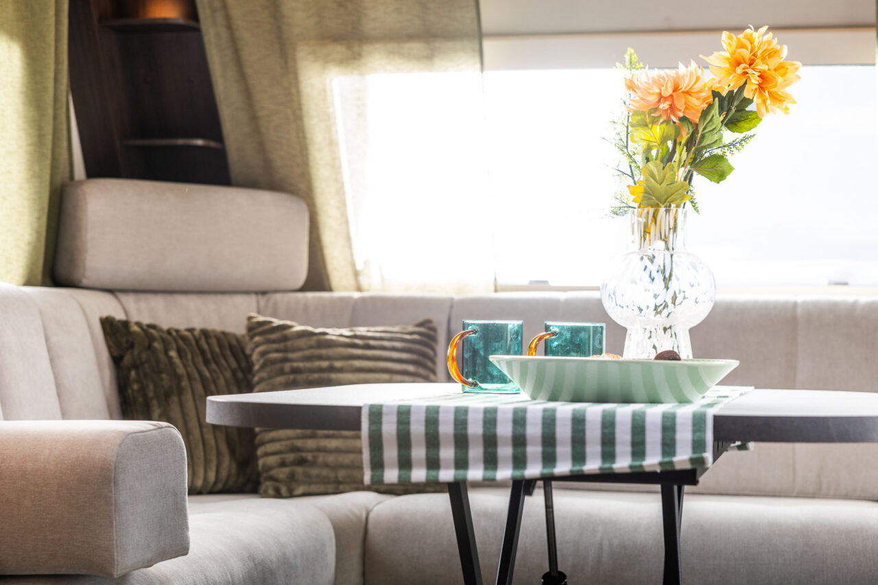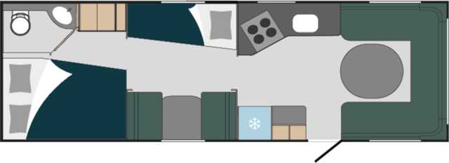 A large caravan with spacious areas and excellent storage. The practical L-shaped kitchen and other comforts make it ideal for an entire season in the mountains or at the summer campsite. The children have their own sleeping area, and the sofa can be quickly converted for guests.