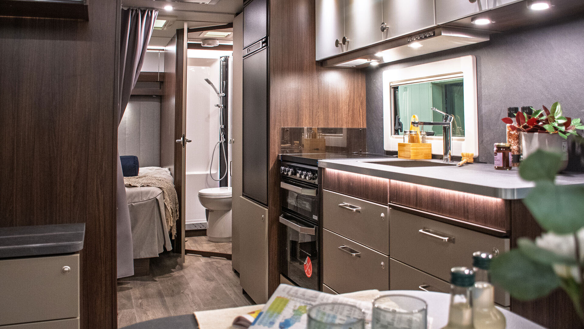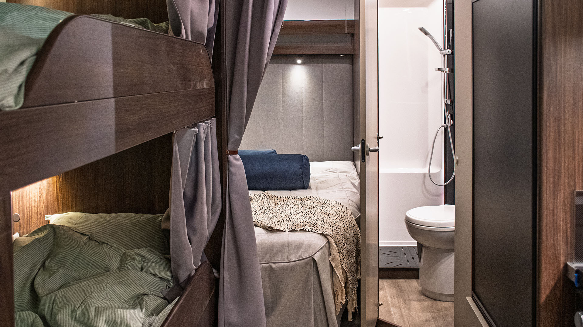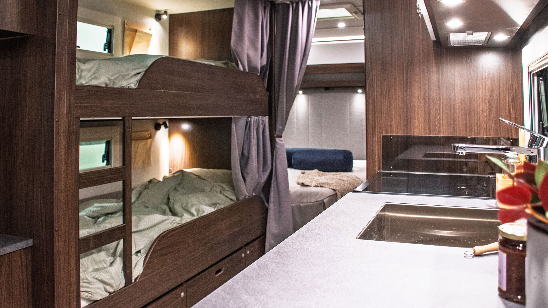 Här har barnen en egen våningssäng som kan skärmas av mot den franska bädden med ett draperi för att skapa en privat känsla. Får ni gäster går det snabbt och enkelt att bädda om soffan för extra sovplatser. Badrummet är utrustat med en hörndusch så att ni inte behöver stanna till vid servicehus för att duscha.
