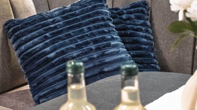 Utsidan är en kombination av svart och blått och insidan går i stilriktig färgsättning med greiga skåpsluckor och köksväggskiva i gråsten. Textilkombinationen Lou ger en hemtrevlig känsla med sittgrupp i ljusgrått och kuddar och gardiner i blåa nyanser.